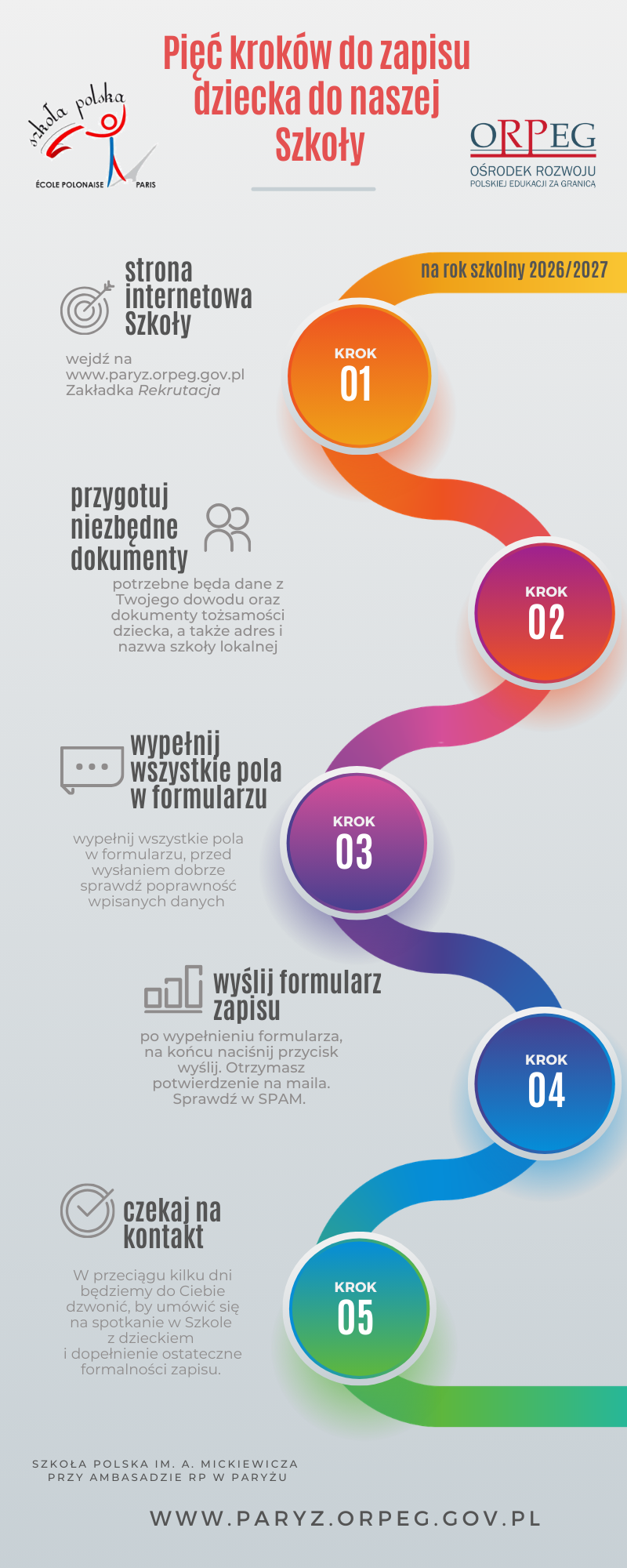 Informacje o rekrutacji, linki do rekrutacji będą opublikowane w podanych wyżej terminach na stronie internetowej szkoły www.paryz.orpeg.pl .W formularzach rekrutacyjnych, które się ukażą znajdą Państwo inne niezbędne informacje dotyczące sposobu ich wypełnienia.